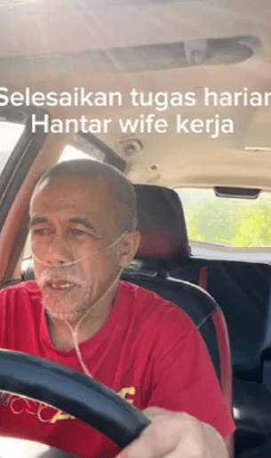 In the clip, the dedicated driver is spotted with an oxygen tube attached to his nostrils, dropping off his wife at her workplace.