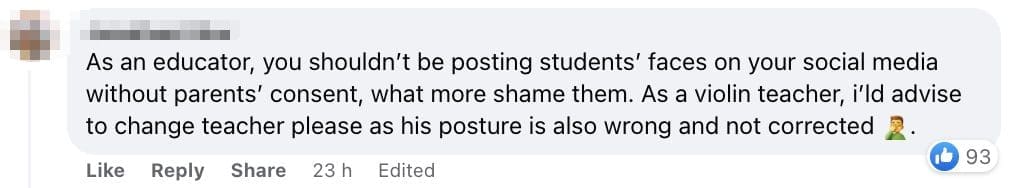 The post, which has since gone viral, saw parents slamming the violin teacher for his unprofessional behavior.