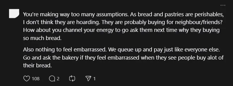 Another felt the OP had jumped into conclusions too quickly by assuming the group of Singaporeans were hoarding bread for themselves and suggested they could’ve been buying it for their neighbours or friends.