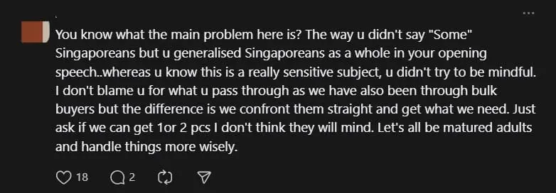 Meanwhile, another bashed the OP for lumping all Singaporeans together as “hoarders” and painting them in a bad light based on a single negative experience.