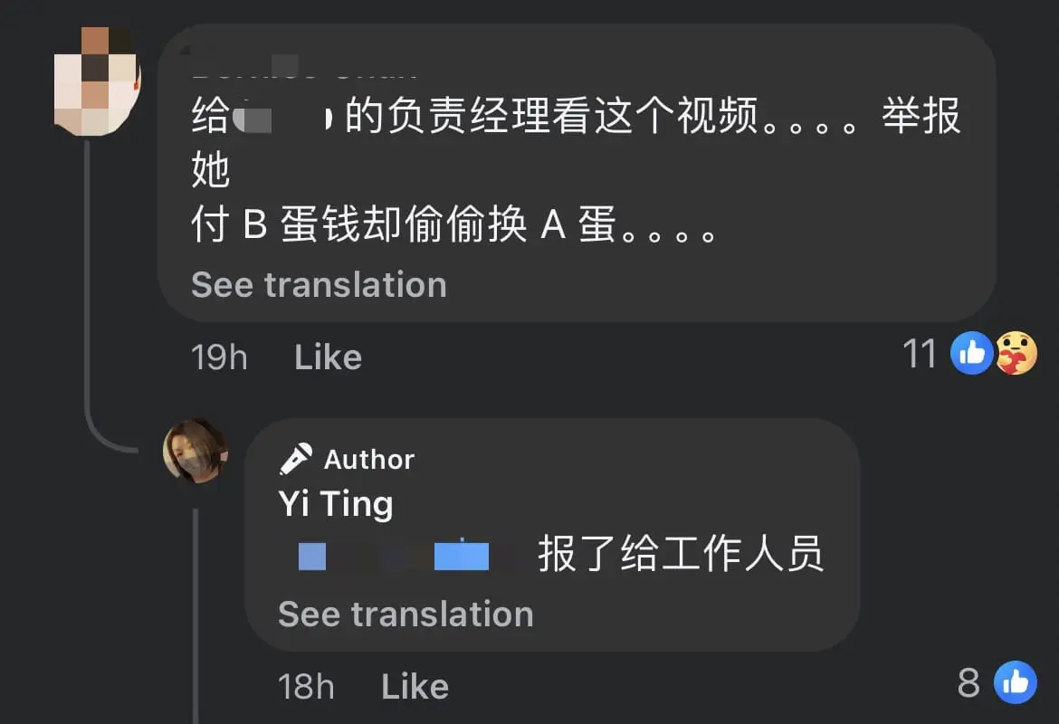 In a 53-second clip uploaded to Facebook by a netizen named Yi Ting, it started out with a middle-aged woman reaching for a carton of eggs from within a cardboard box. For a split second, she looks around to ensure no one else was in sight.