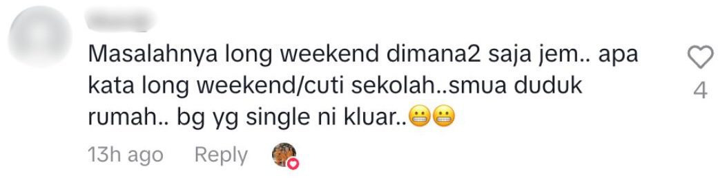 One wrote: “The problem with long weekends is there’s traffic everywhere. Why not let families stay home during long weekends or school holidays and let single people go out instead?”
