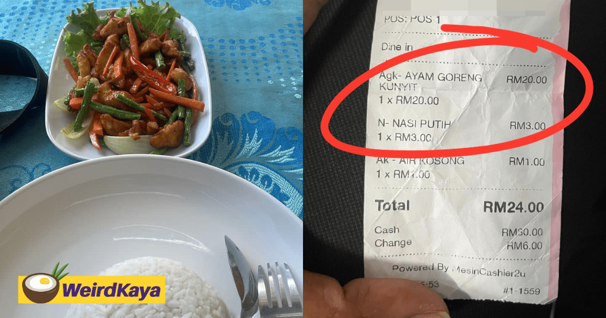 As per the receipt she posted, it shows that the restaurant charged RM3 for plain rice, RM20 for a serving of turmeric fried chicken (intended for one person), and RM1 for plain iced water, summing up to RM24.