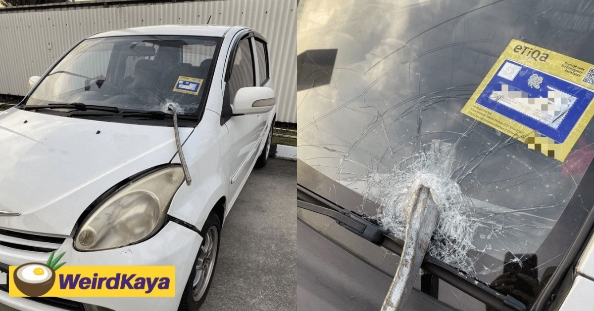 Out of nowhere, a metal pole came flying off the back of the lorry and lunged toward her direction, where it pierced right through the windshield on the front passenger’s side.