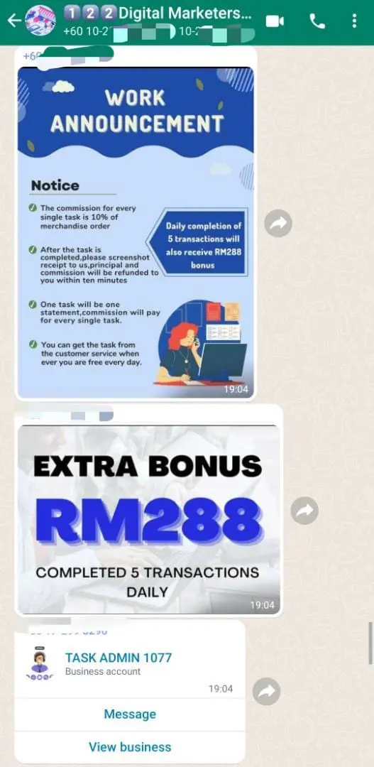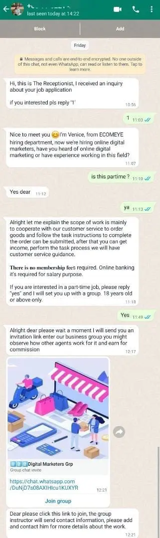 After expressing her interest, an admin referred her to another person who claimed to be from a marketing company for further instructions.