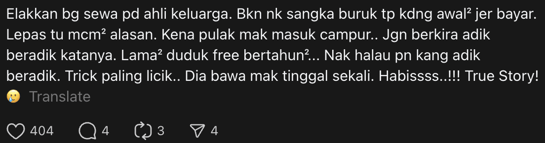 She said she pays RM1,400 a month to the bank for the house. However, her mother allegedly suggested that she rent the unit to her siblings for just RM600 a month, citing the idea of a “family price”.
