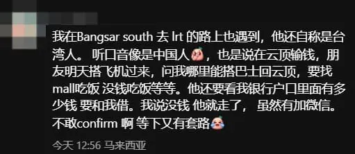 “I also met him on my way to IRT in Bangsar South. He claimed to be Taiwanese, but his accent sounded Chinese. He said he lost money at Genting Highlands and that his friend was flying in tomorrow, asking me where he could catch a bus back to Genting, and pretending to look for a mall to eat without money. He even wanted to see how much money I had in my bank account and asked to borrow from me. When I said I had no money, he left, though he added me on WeChat. I’m not sure what to make of it, afraid it might be another scam.”