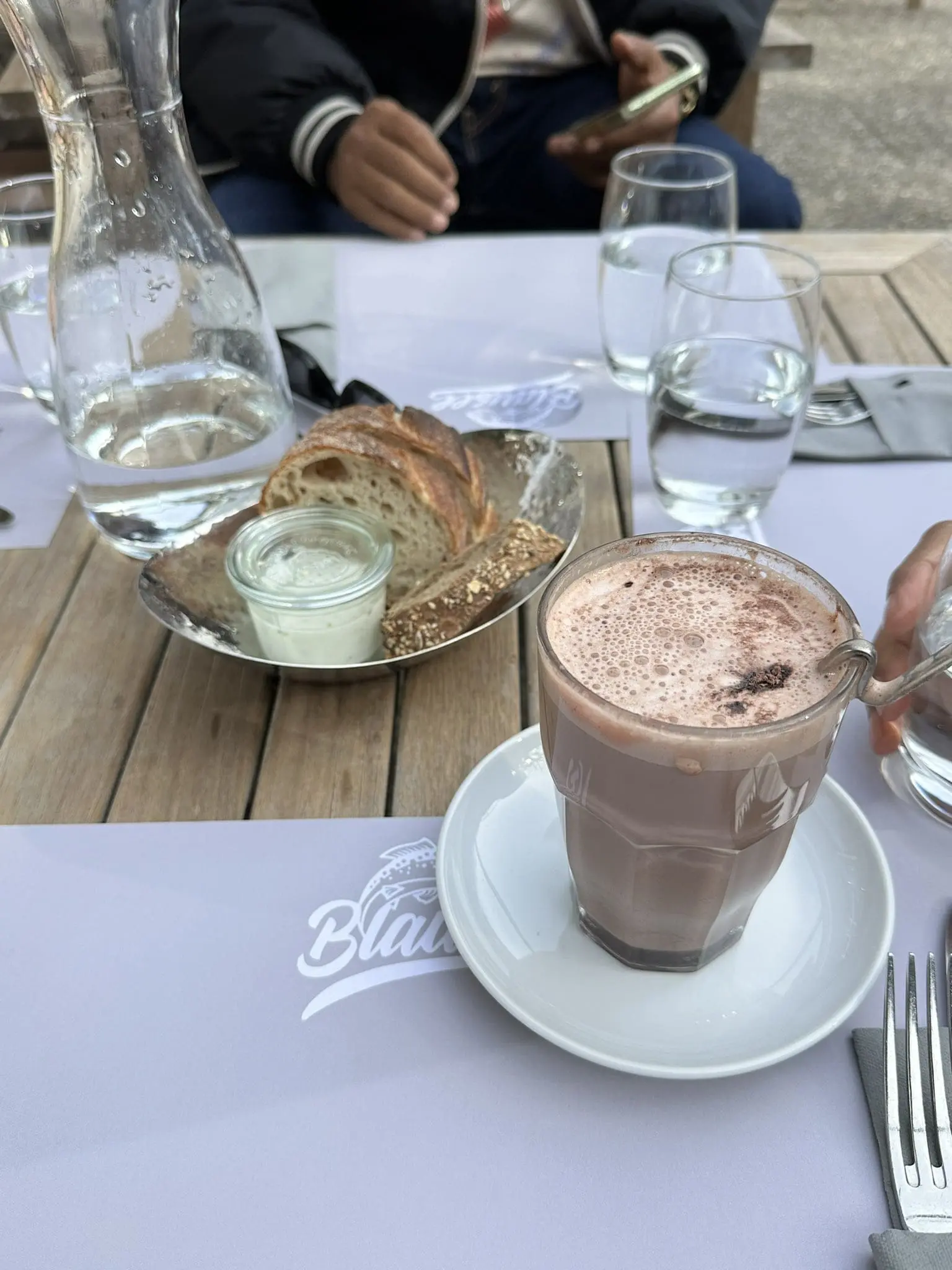In the second picture, slices of baguette are shown paired with dipping sauce, alongside a hot drink.