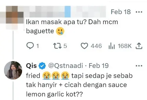 An X user asked, “What fish is that? It looks like a baguette,” to which she replied, clarifying that it is actually a fried fish. She also mentioned that it tastes delicious because it doesn’t have the fishiness smell, especially when paired with lemon garlic sauce.