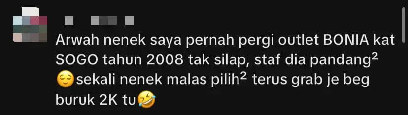 ‘My late grandmother went to Bonia at SOGO back in 2008 and the staff gave her judgmental looks. In the end, she chose an ugly bag which cost RM2,000.’