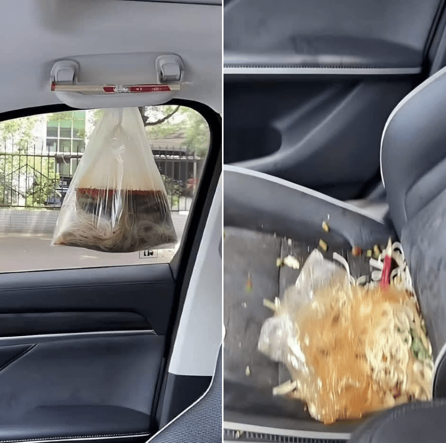 In a Facebook post that quickly gained attention, the OP shared two photos — one showing the initial setup with the noodle bag dangling mid-air from a pair of chopsticks acting as the ‘handle’, and another showing the aftermath: soup, noodles, and regret splattered all over the car seat.