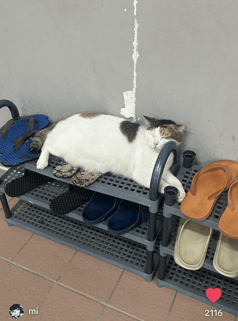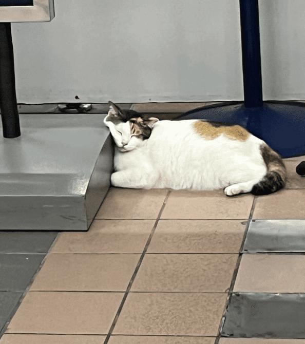 There are also shots of her snoozing on top of ticket machines, lounging on benches, perched on railings, and even using a shoe rack as her personal bed.