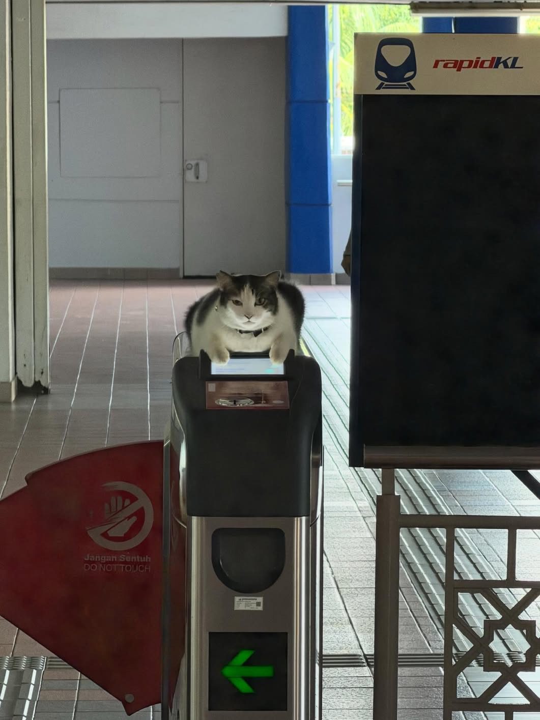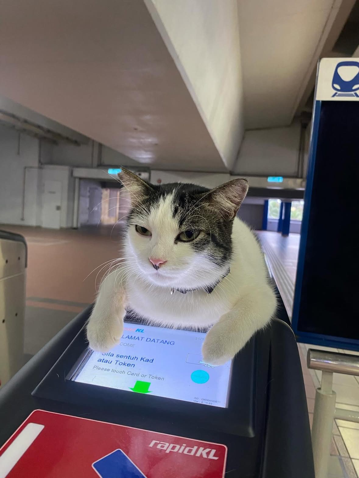 Photos attached showed the cat sitting right on top of the fare gate, paws resting near the scanner, as if it was personally approving or rejecting every passenger.