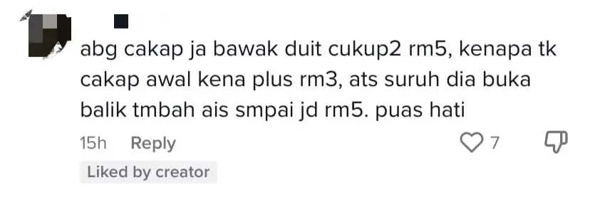 Another user suggested a clever response, saying, “You should’ve just told them you only had RM5 and asked why they didn’t mention the extra RM3 earlier. Then ask them to add more ice until it’s worth RM5. That would be satisfying.”