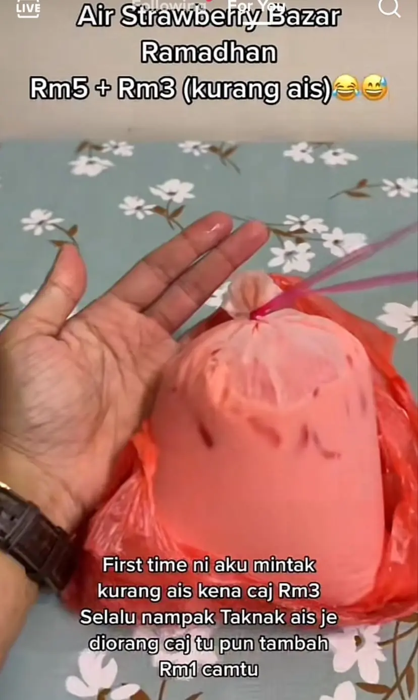 User @eshamsoda posted a two-minute video recounting his experience at the bazaar, where he ordered a strawberry drink for RM5. But when he requested for less ice, he was told he’d have to fork out an additional RM3!