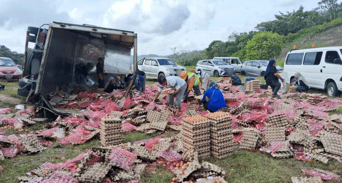 A lorry carrying thousands of eggs overturned on the East Coast Expressway 2 (LPT2) early this morning, turning the highway into an impromptu egg hunt as passersby rushed to collect the scattered eggs.