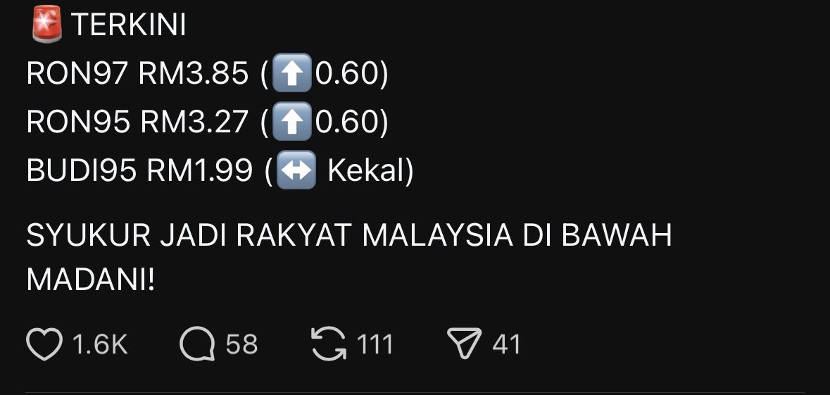The topic began circulating on Threads after a user shared an update on fuel prices, stating that RON97 is RM3.85, RON95 is RM3.27, while the subsidised BUDI95 price remains at RM1.99 per litre.
