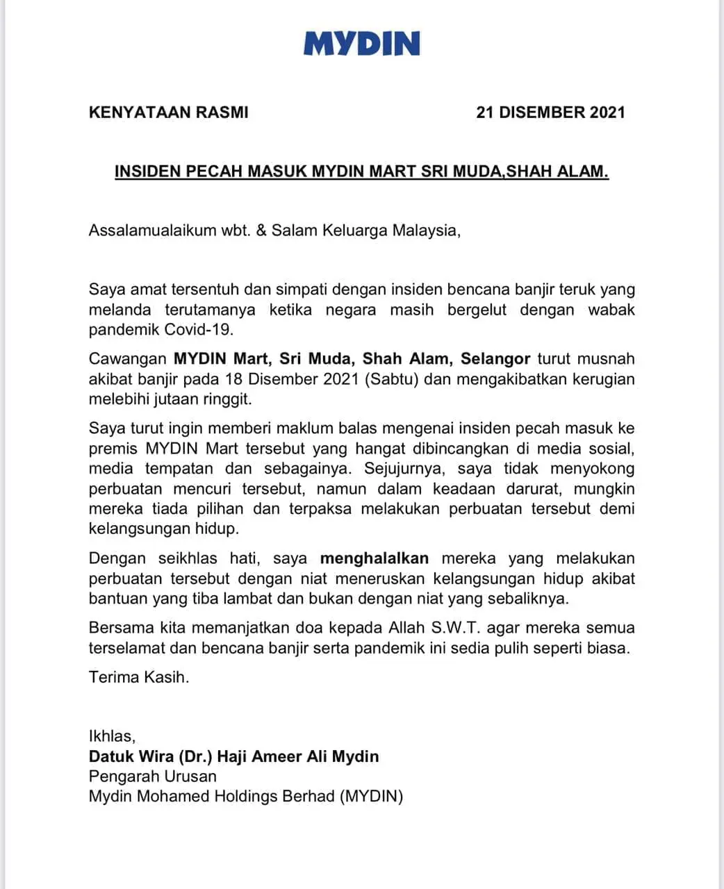 Aside from the looting, The Star also reported that the company is facing losses amounting from RM200,000 to RM300,000 due to the flood according to its managing director Datuk Ameer Ali Mydin.
