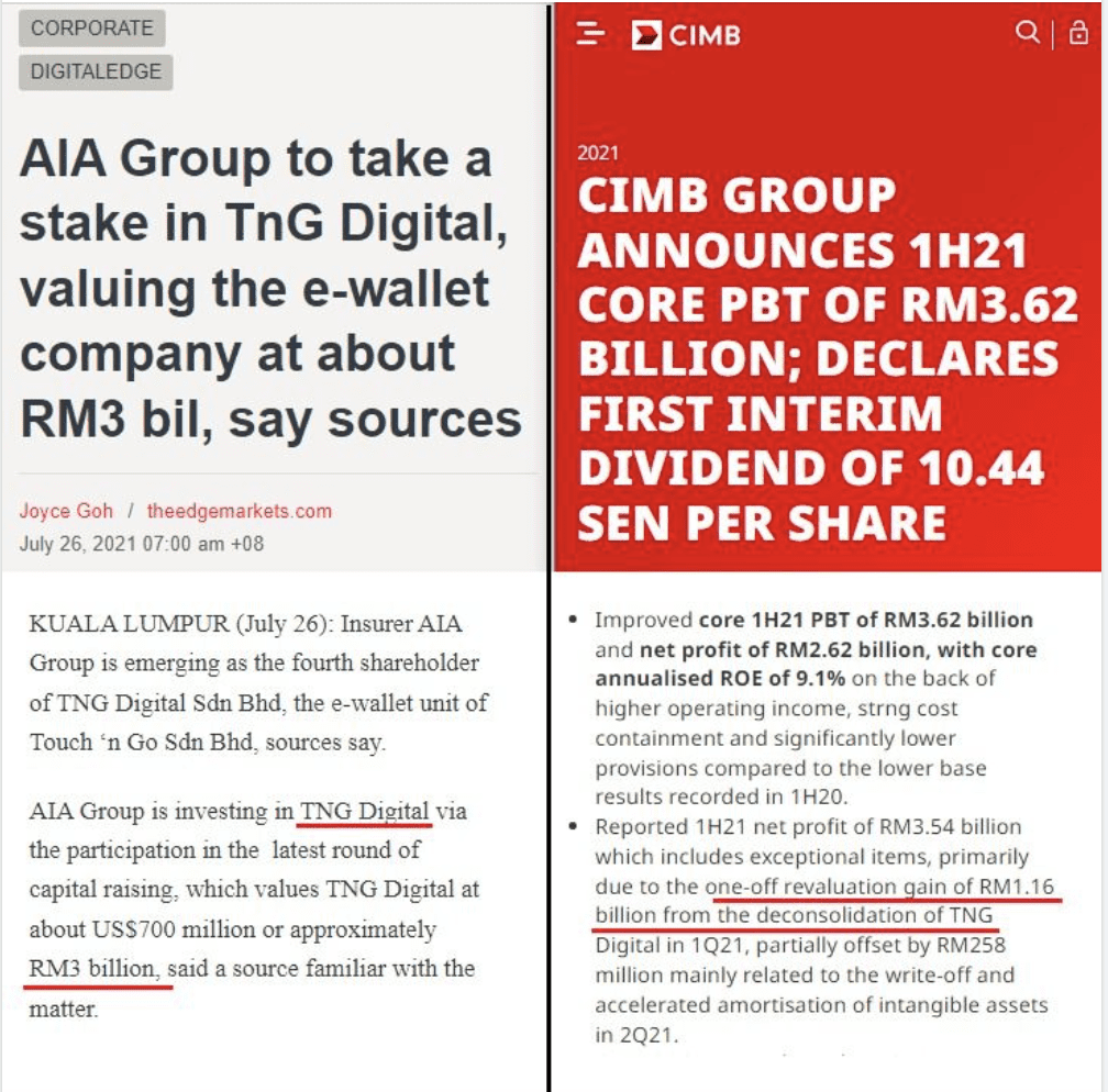 In a follow-up post, he posted several screenshots which showed that Touch ‘n Go is currently valued at RM3 billion and that CIMB had earned a profit of RM1.16 billion last year.