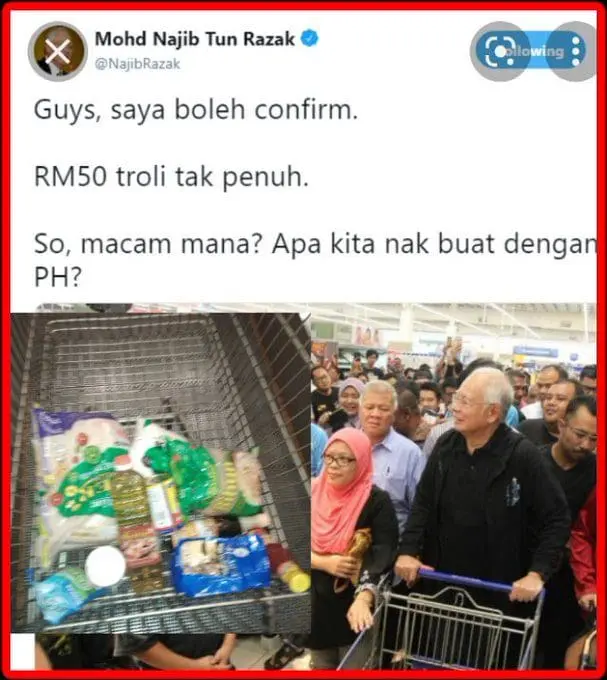 Najib troll zaman PH, rm50 tak penuh troli. Tiba² Allah balas, … zaman BN, dapat satu botol minyak je … tidak trrmasuk tudung.