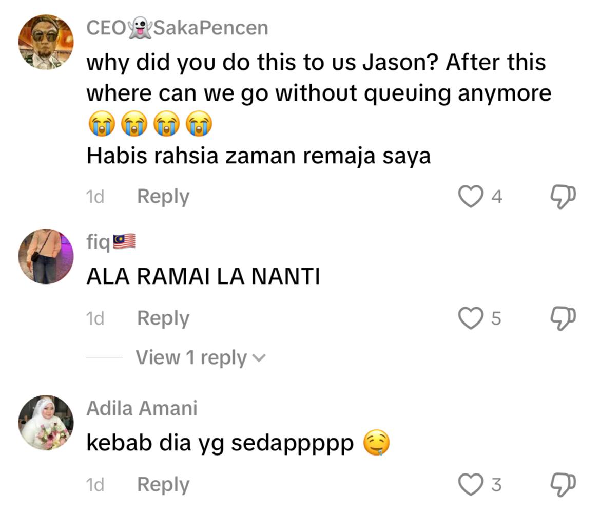 Mereka juga berseloroh meminta Jason untuk memadam video tersebut kerana risau lokasi itu akan dipenuhi orang ramai sekaligus perlu menunggu lama bagi mendapatkan makanan kegemaran mereka.