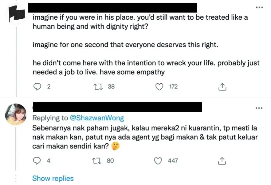 Another said that foreign workers were human beings too and deserve to be treated with dignity and respect.