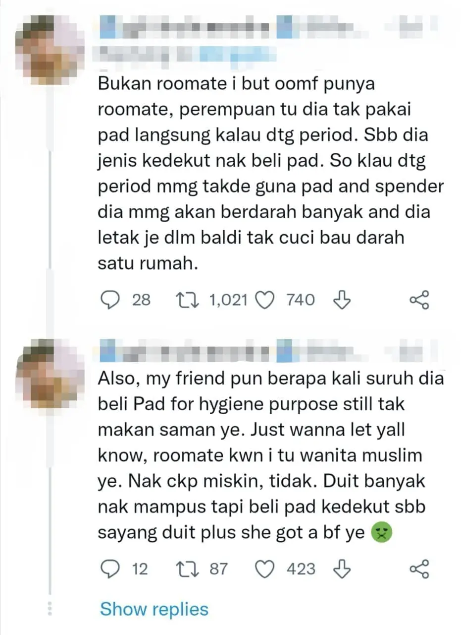 One wrote, “While she wasn’t my roommate, she was so stingy to the point where she refused to buy menstrual pads to wear when she was on her monthly cycle and would also soak her bloody underwear in a pail without washing them.”