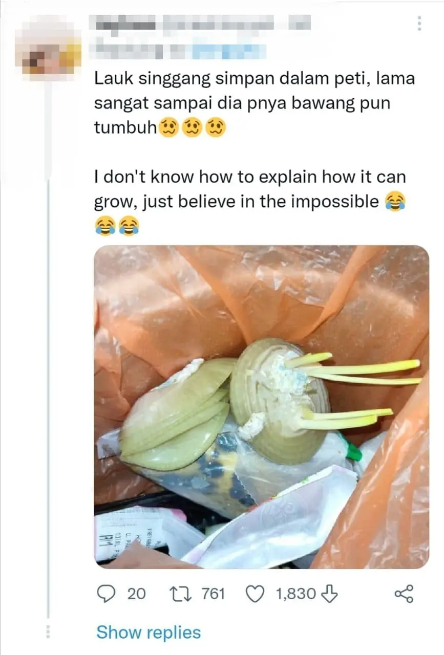 Many were also dumbfounded by a photo of an onion sprouting inside the fridge as a result of leftovers being kept for far too long. Maybe he/she thought this was Farmville IRL.