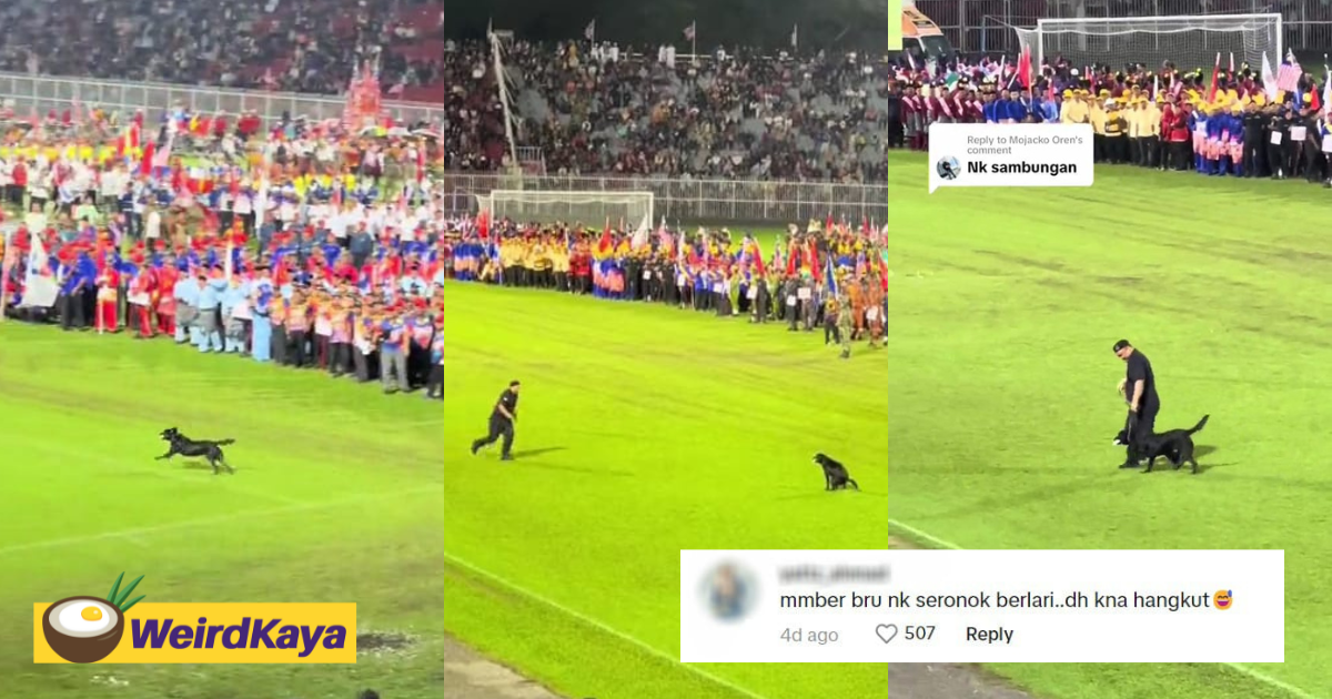 Sharing the hilarious incident through her TikTok account, user @cikbungalofaa posted a video featuring an energetic black K-9 dog that made an unexpected run after its Merdeka Day performance, which was held at the Sultan Muhammad IV Stadium in Kota Bharu, Kelantan.