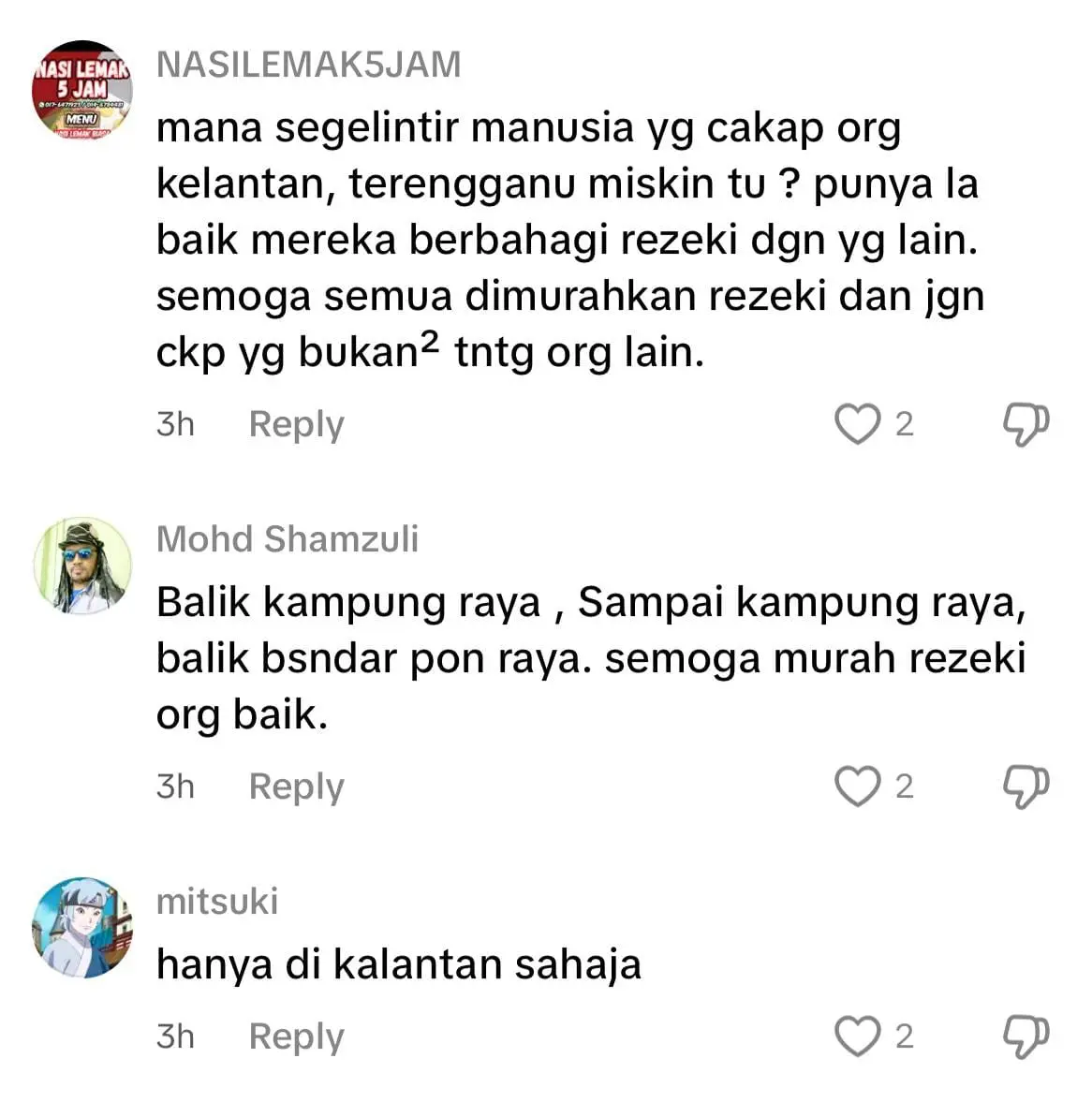 Menelusuri ke ruangan komen, wargamaya memuji keikhlasan orang Terengganu kerana sudi berkongsi rezeki kepada orang lain dan ada juga yang mendoakan agar mereka terus dilimpahkan dengan kekayaan yang berpanjangan.
