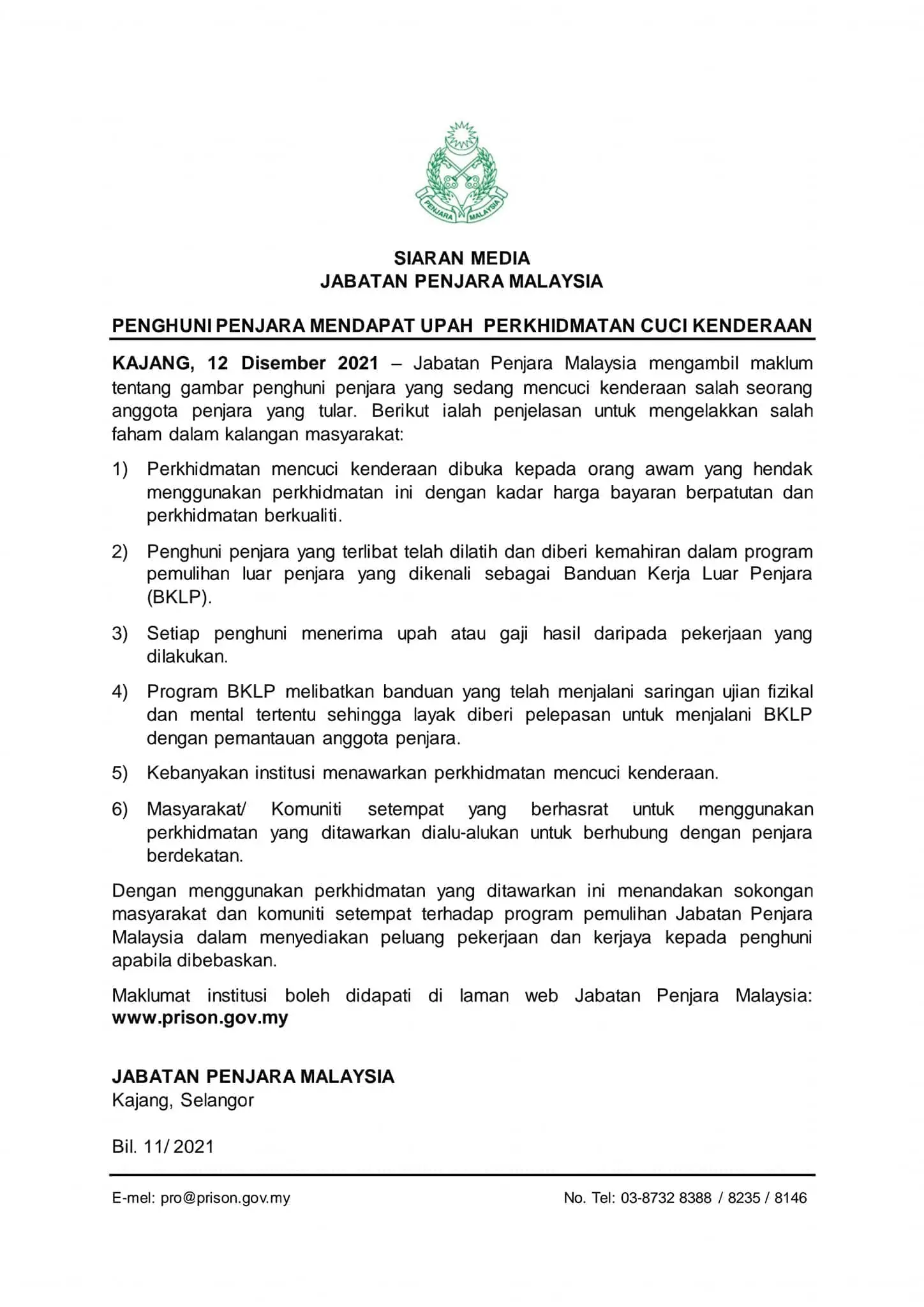 “Most prison institutions also offer car wash services which is open to the public at a reasonable price,” the statement read.