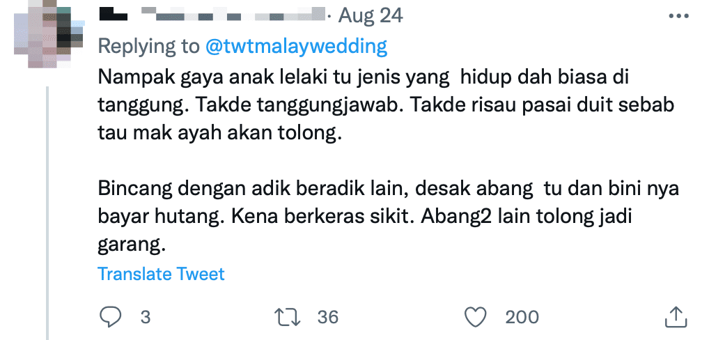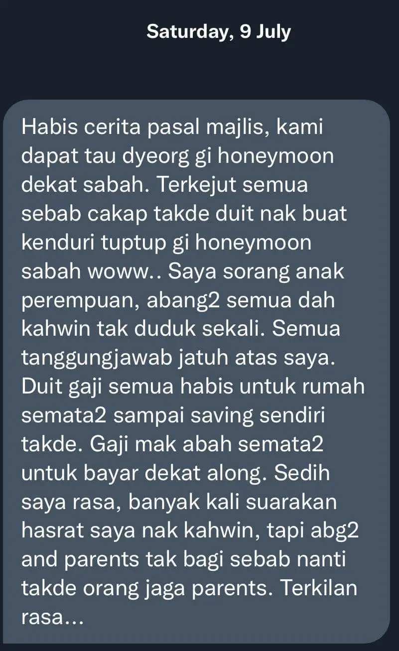 The parents have to burden the entire cost of the wedding while the bridegroom only paid RM7,000 for the wedding couch and loaning the wedding suit.