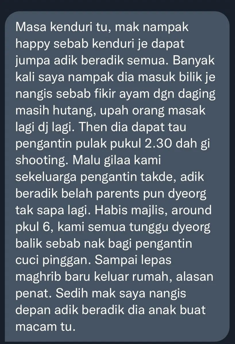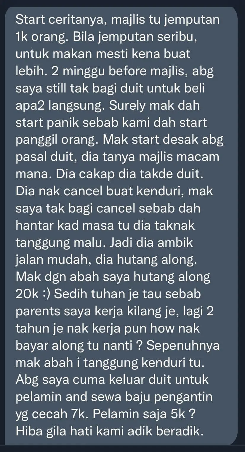 Recently, a post shared by TwtWedding has gone viral on Twitter as the original poster (OP) recounted her experience in which her parents borrowed loan shark to continue hosting her brother’s wedding.