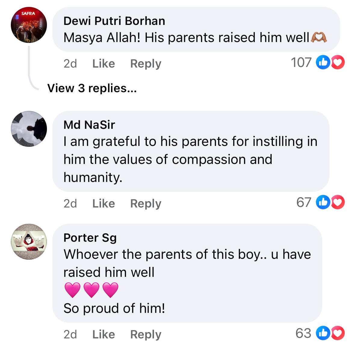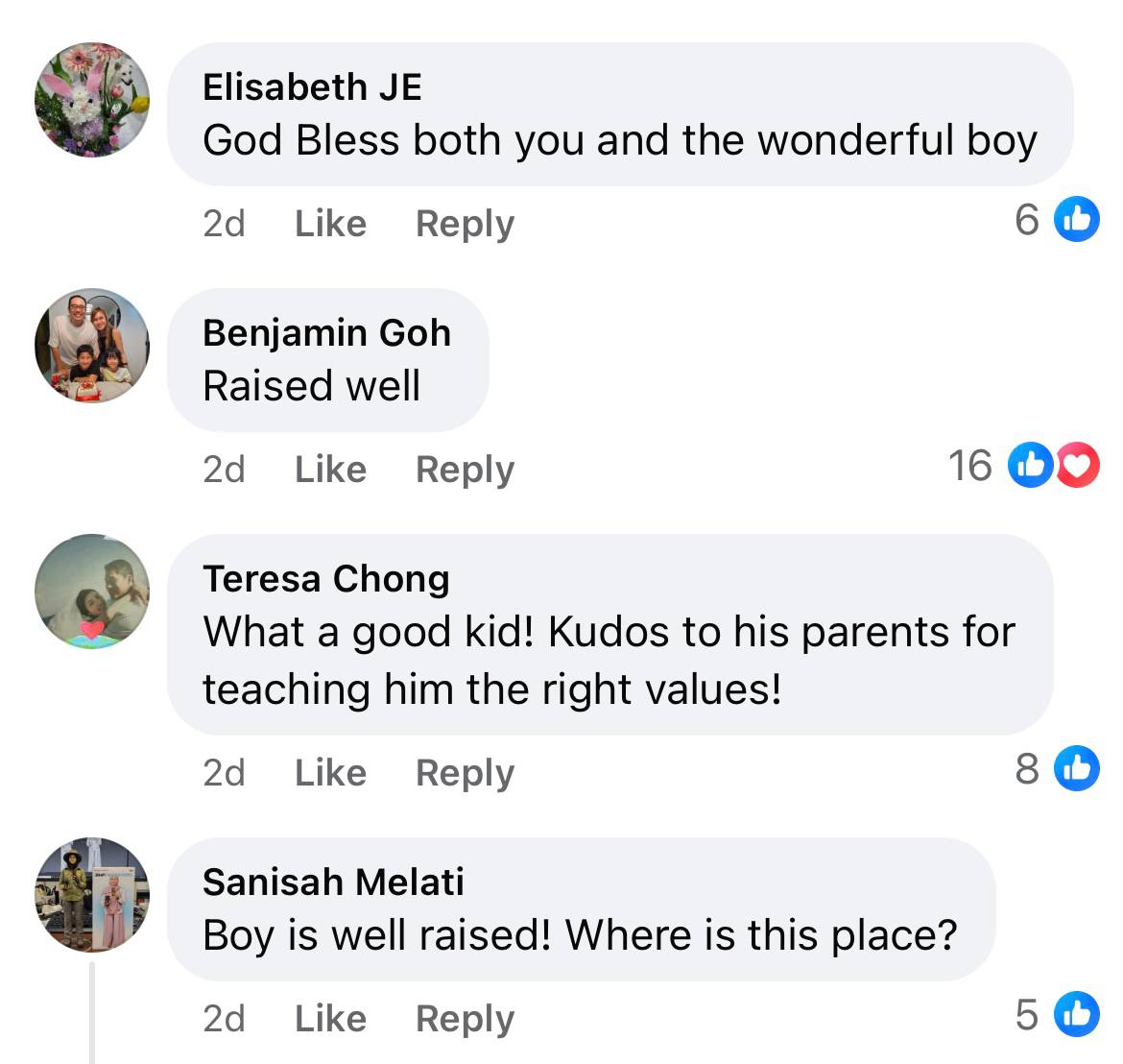 Perkongsian tersebut menerima pelbagai reaksi balas warganet dan rata-ratanya memuji sifat baik yang ditunjukkan oleh budak lelaki itu kerana prihatin memberi bantuan kepada mereka yang lebih memerlukan.