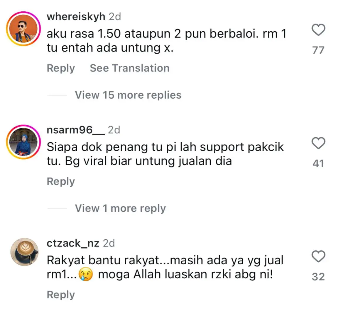 Aku rasa RM1.50 ataupun RM2 pun berbaloi. RM1 tu entah ada untung atau tak. Semoga murah rezeki selalu pak cik.
