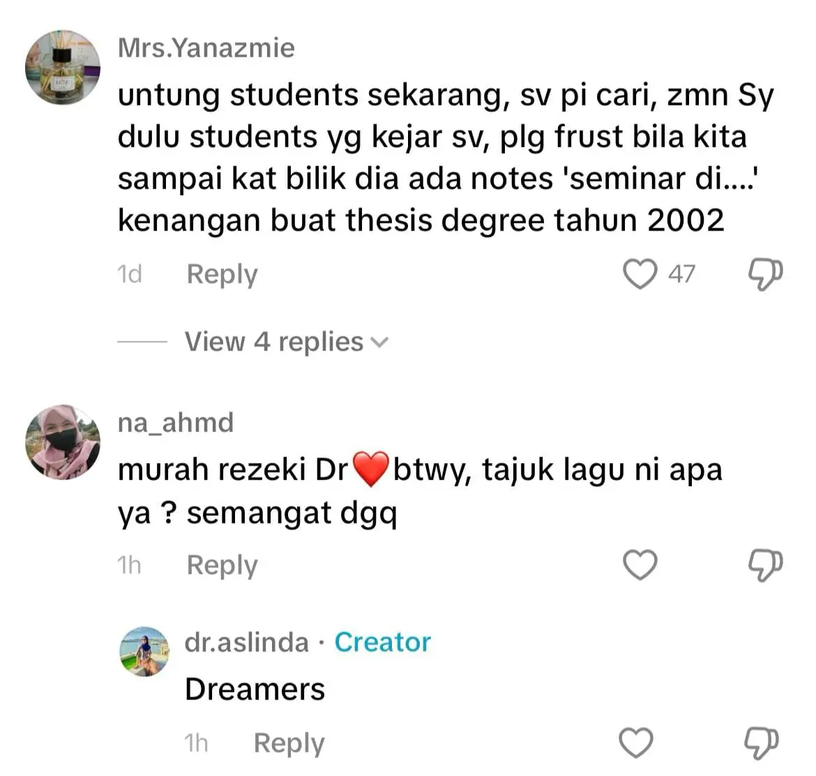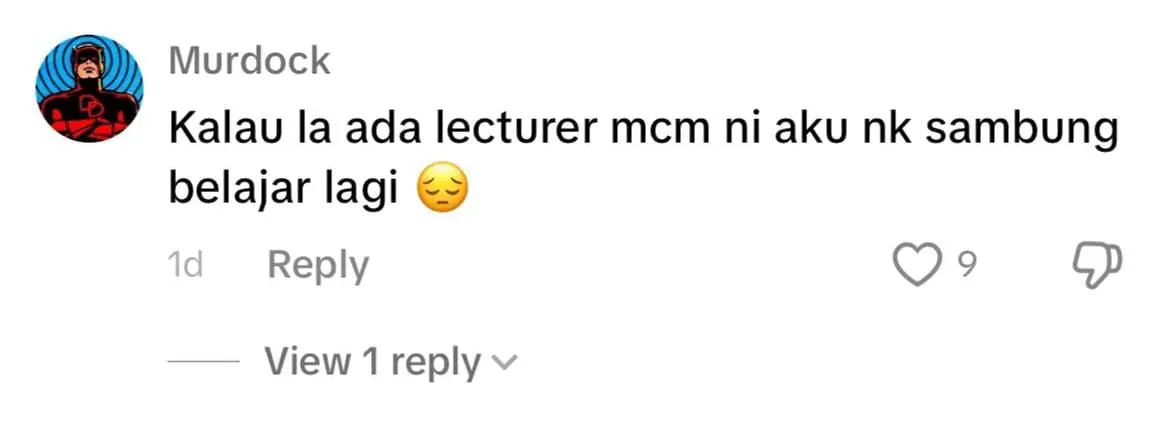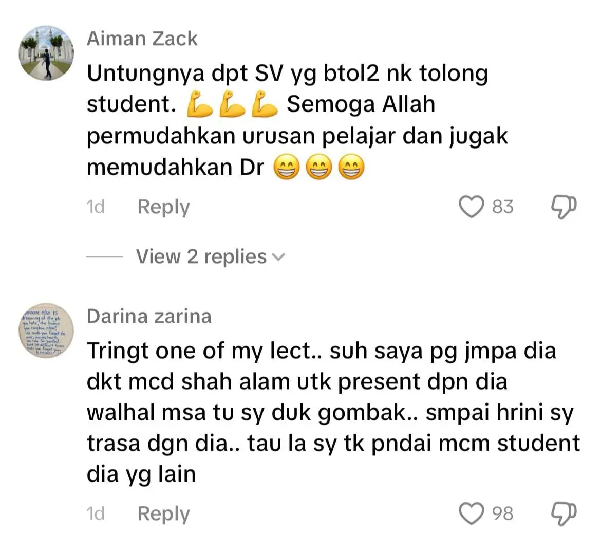 Menelusuri ke ruangan komen, warganet memuji sifat prihatin Aslinda dan ada juga yang menzahirkan rasa syukur melihat keikhlasan pensyarah terbabit dalam membantu pelajarnya.