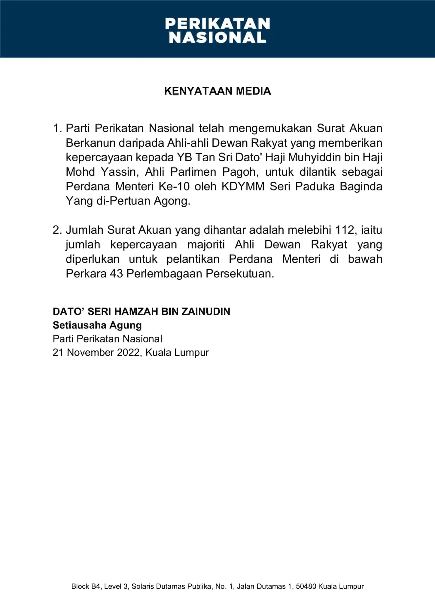 Perikatan Nasional has released a press statement stating that the coalition has submitted statutory declarations(SDs) from 112 MPs to Istana Negara.