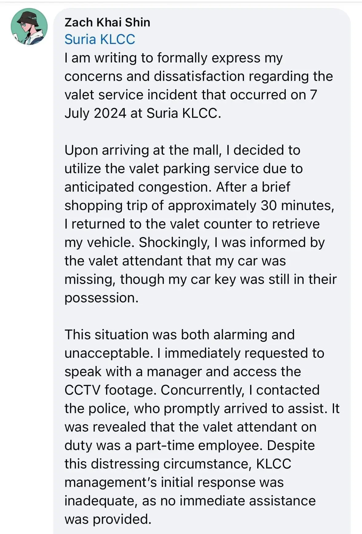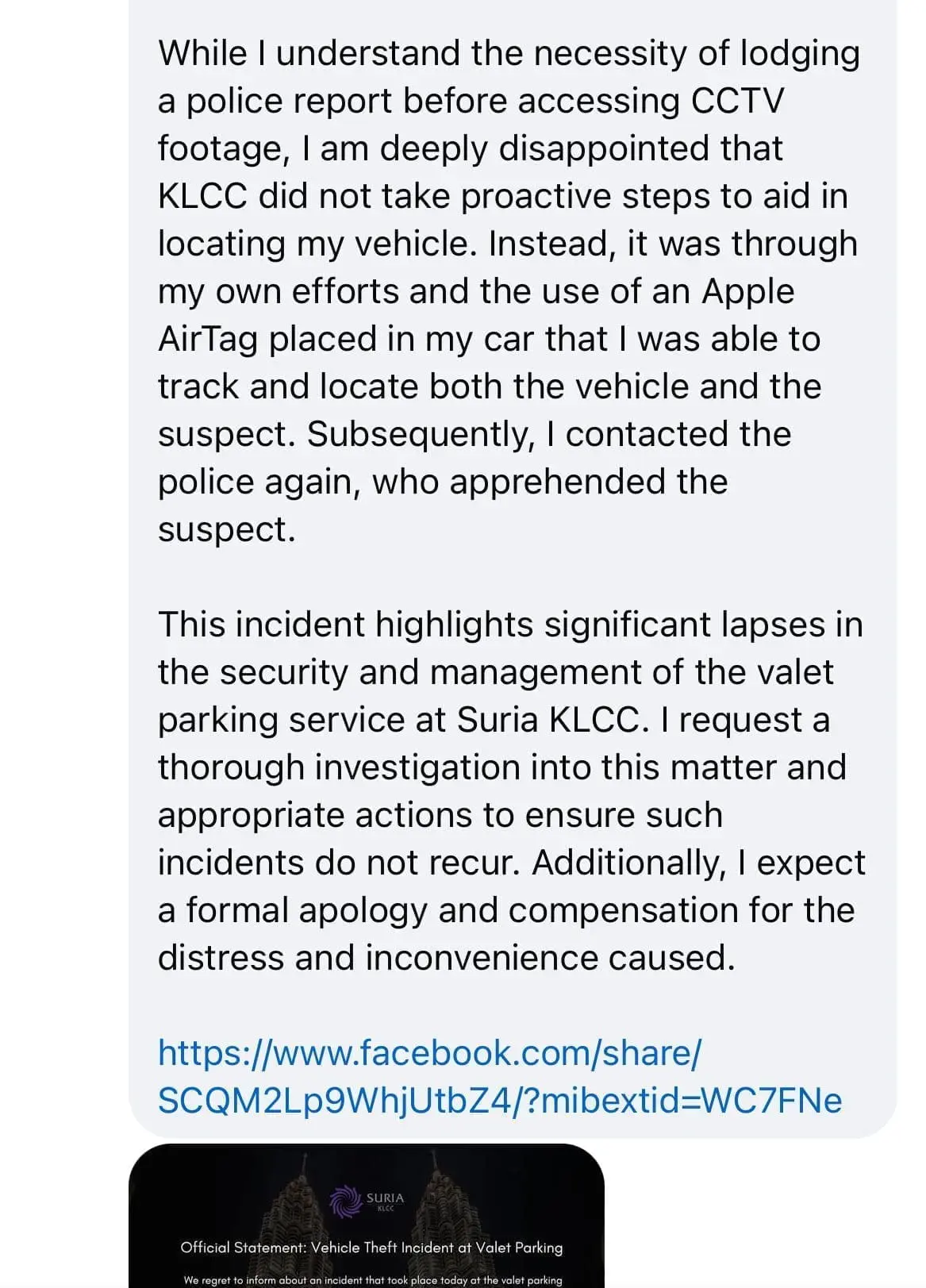 “Suria KLCC management needs to explain how a car can be stolen from a secure valet parking service in broad daylight,” the owner stated.