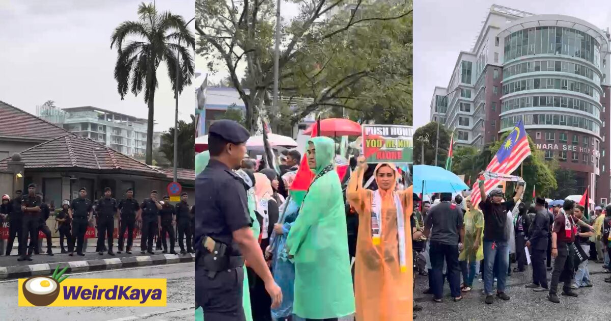 M’sians Brave Heavy Rain To Protest Near US Embassy After Israel Detains M’sians In Gaza Aid Flotilla