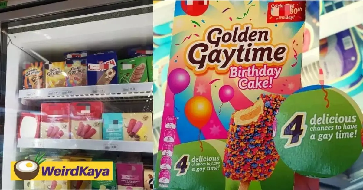 According to a quick check by local media, the controversial packaging was found at a supermarket in Kuala Lumpur, where it had the phrase ‘Golden Gaytime’ and ‘Delicious Chances To Have A Gay Time!’ printed on it.