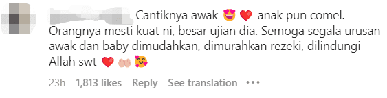 “You’re so beautiful, your kid is also cute. She must be strong, her test is tough. Hope everything of you and your kid goes smoothly, wishing you protection from Allah.”