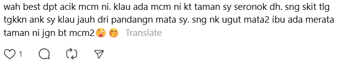 “Wah, it’d be great to have an aunty like this. If someone like her lived in my neighbourhood, it would be so nice. It’d be easier to watch over my kids when they’re out of my sight. Easy to threaten the kids by saying there are aunties everywhere in this taman, so don’t misbehave.”