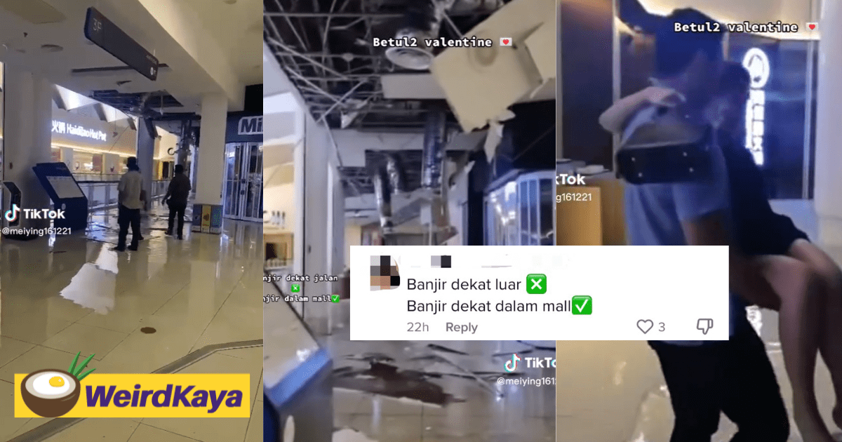 Diners who were enjoying a romantic dinner at Penang’s Queensbay Mall on Valentine’s Day were treated to a very watery ambience after the ceiling the third floor collapsed following a downpour.