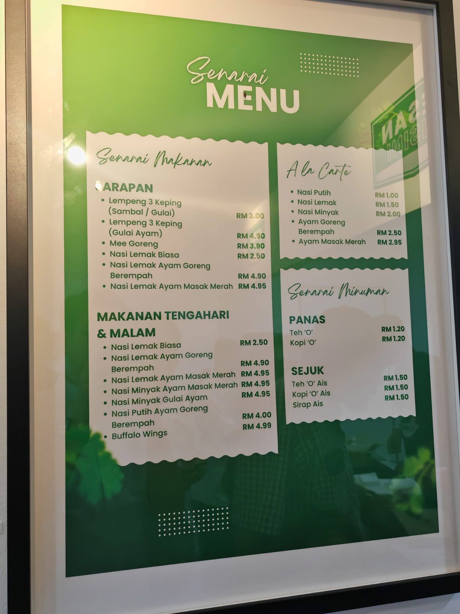 Sebagai contoh, nasi lemak ayam goreng hanya berharga RM4.90, mi goreng RM3.90, manakala kepak ayam pedas RM4.99.