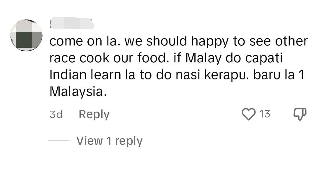 Come on la. we should happy to see other race cook our food. If Malay do capati Indian learn la to do nasi kerapu. baru la 1 Malaysia.