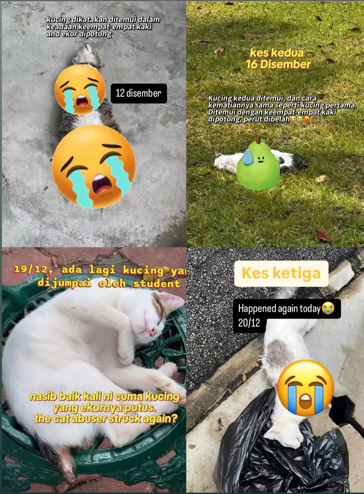 However, more cats were found to be injured and killed on 20 December.