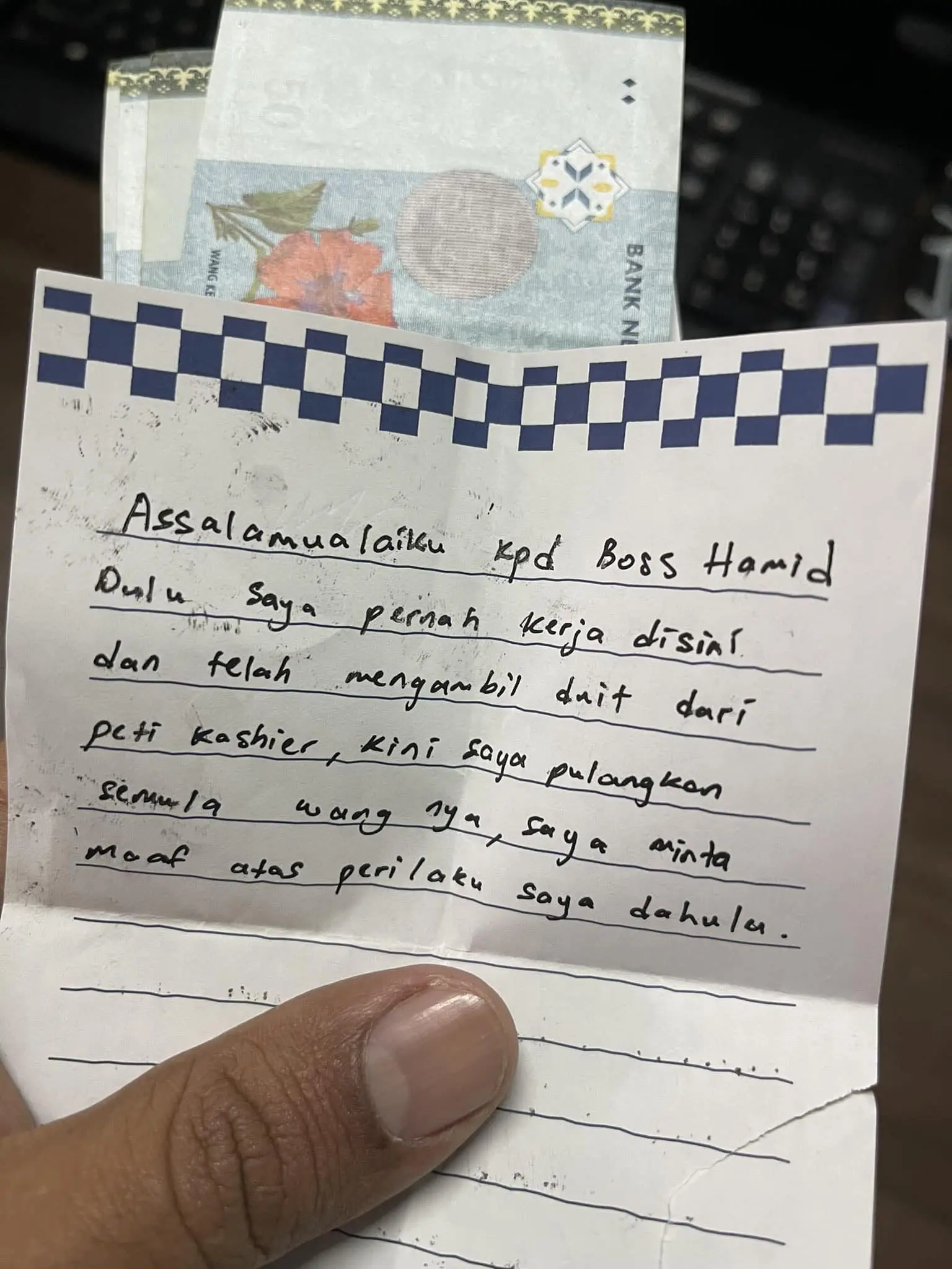 The letter read, “Assalamualaikum to boss Hamed. Before this, I used to work here and I took money from the cash register. Now, I am returning the money, I apologise for my prior actions.”
