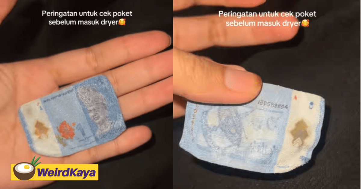 A man was left feeling helpless yet amused at the same time after he stumbled across an RM1 note which was shrunk to a size you’d think was meant for animals’ use after it was placed into the dryer.