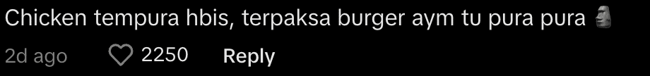Netizens were quick to poke fun at the situation, with one user commenting, “The chicken tempura ran out, so they had to make the chicken burger pretend to be tempura,” while another chimed in, calling it “chicken pura-pura,” a playful jab at the patty’s less-than-authentic tempura disguise.