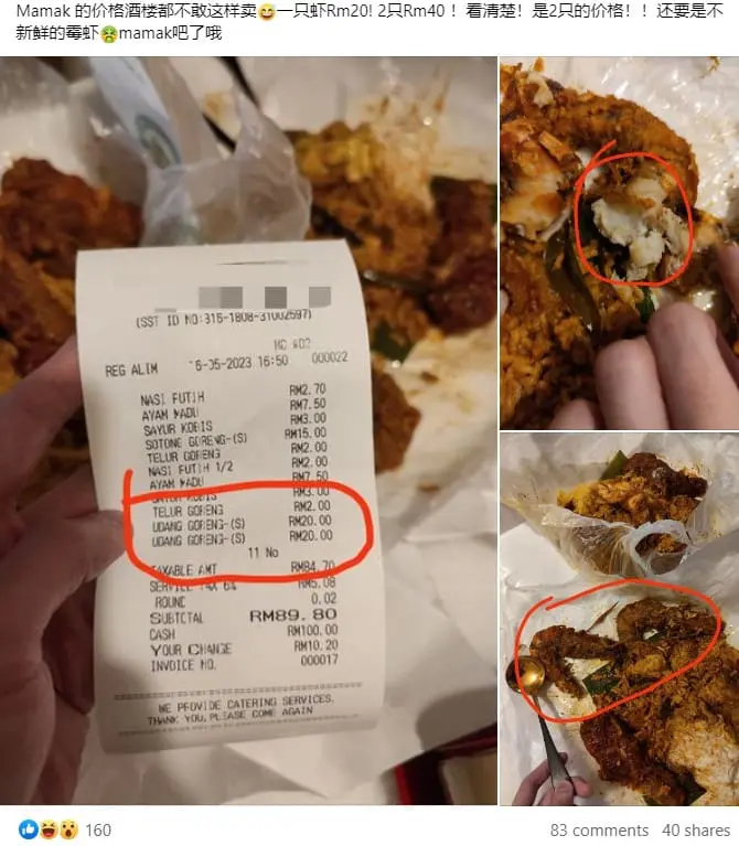 Prawns are often seen as a luxury item in many seafood meals, but a Malaysian man was taken aback when he had to part with RM89.80 for a mamak meal, in which two prawns cost a staggering RM40.